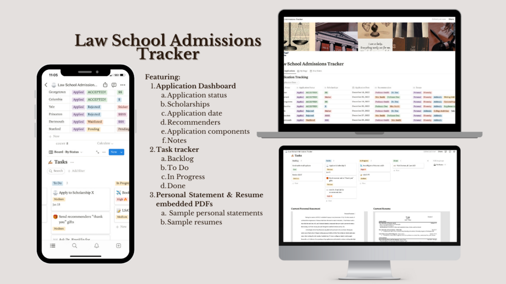 Keep track of your progress with the "Law School Admissions Tracker & Planner" Notion template! For the 2024-2025 application cycle (or future cycles!). I first made this template for my personal use, and found it so helpful that I made one with love to share with you all.