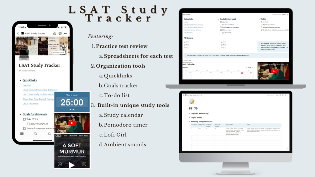 With this template, you'll access a variety of tools that will help you stay organized, focused, and on track with your LSAT prep. Here are just a few of the features you can expect: